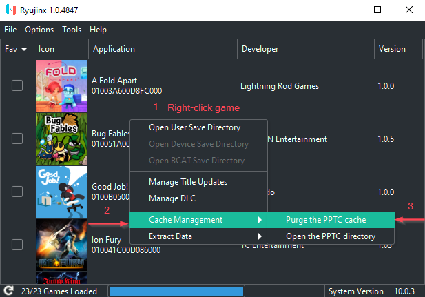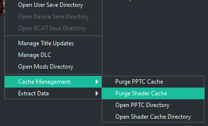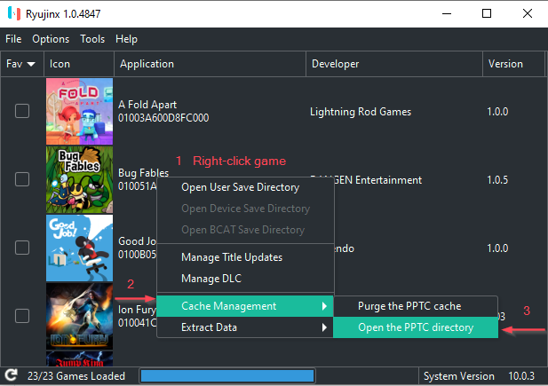 - Ryujinx를 연 상태에서 게임 목록에서 보고 싶은 PPTC 캐시 파일이 있는 게임을 마우스 오른쪽 버튼으로 클릭합니다. 그러면 팝업 메뉴가 나타납니다.