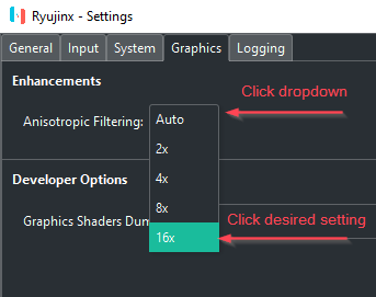 - Graphics 탭 으로 이동하여 Anisotropic Filtering 옆에 있는 드롭다운을 클릭합니다 . 원하는 수준으로 설정하십시오. 저장