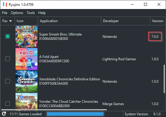 - 기본 Ryujinx 게임 목록 창 에 올바른 버전 번호가 표시되는지 확인합니다 .