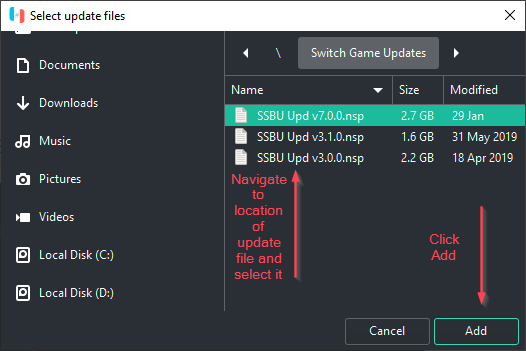 - 추가 를 클릭하면 탐색 메뉴가 나타납니다. 게임의 업데이트 파일 위치로 이동하여 Ryujinx 에 추가할 업데이트를 선택하고 추가 를 클릭 합니다 .