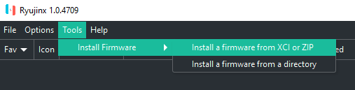 - 이제 Ryujinx 가 열리면 도구 > 펌웨어 > XCI/ZIP에서 설치를
