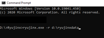 - 명령 프롬프트를 열고 Ryujinx 실행 파일 위치로 이동한 후 ryujinx.exe -rd:[folderpath] 명령을 입력합니다. 예를 들어, 사용자 지정 폴더가 d:\ryujinxdata인 경우 명령은 따옴표 없이 다음과 같습니다( 이는 예일 뿐입니다. 선호하는 사용자 지정 폴더 이름 사용 ). "ryujinx.exe -rd:\ryujinxdata"