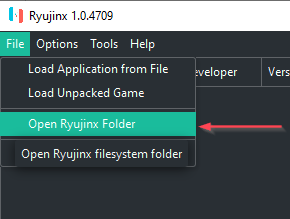이제 Ryujinx 가 실행되었으므로 %appdata% 폴더에 적절한 폴더가 생성되었습니다. - Ryujinx 창의 왼쪽 상단에 있는 파일 을 클릭 한 다음 Ryujinx 폴더 열기 를 클릭 합니다.