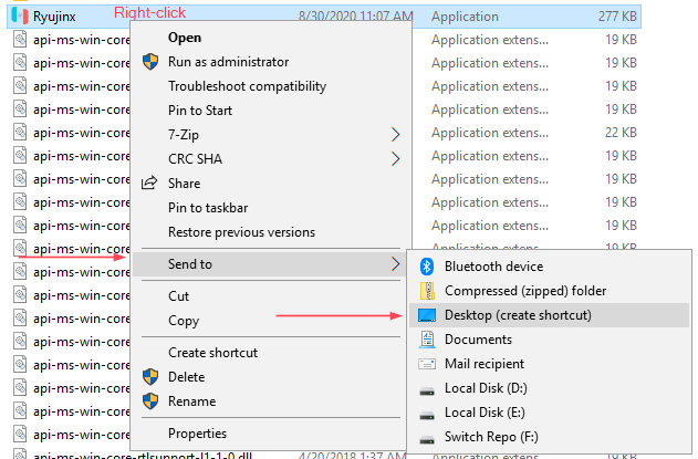 - Ryujinx 실행 파일을 마우스 오른쪽 버튼으로 클릭하고 보내기 -> 바탕 화면 바로 가기를 클릭합니다.