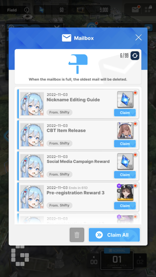 - 챕터 0을 클리어하면 받은 편지함에서 사전 등록 보상을 청구할 수 있으며, 10 풀 1회에 충분한 프리미엄 통화를 받을 수 있습니다.