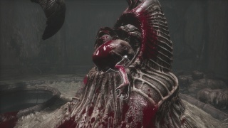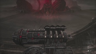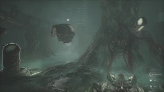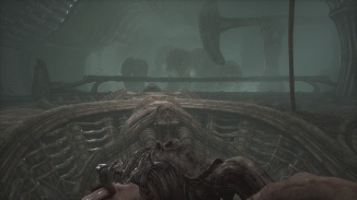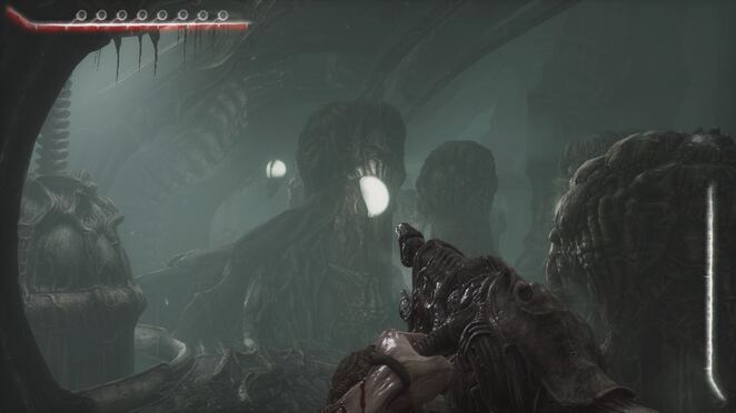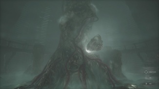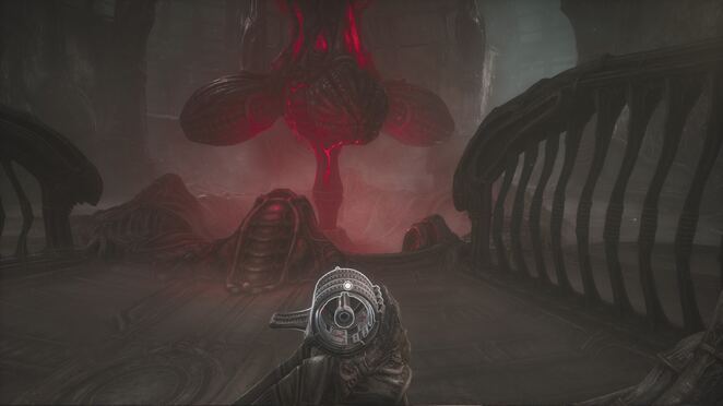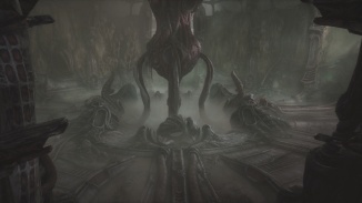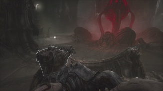 트리를 향한 기본 콘솔에서 이제 오른쪽으로 이동하려고 합니다. 이전 방과 마찬가지로, 빛나는 반점과 그 앞에 있는 콘솔이 있는 또 다른 크고 살이 많은 성장을 찾으려면 살이 많은 기둥 모음을 지나쳐야 합니다. 이것과 상호 작용하려면 이전에 주운 무기를 사용해야 합니다.