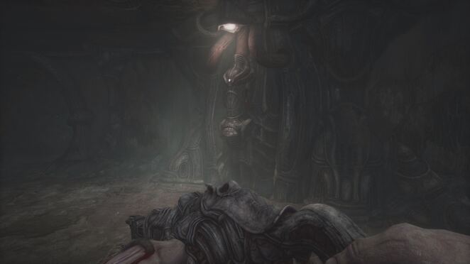 안으로 들어가면 근처 게이트를 찾으십시오. 이것의 왼쪽에는 그 위에 빛이 있고 손을 넣을 수 있는 슬롯이 있는 메커니즘이 있습니다. 이를 위해 기계와 상호 작용하십시오. 그것은 우리에게 Flesh Key를 줄 것입니다.
