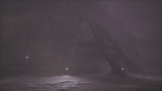 두 번째 아치 길을 따라 계속 진행하다가 오른쪽으로 내려가는 경사진 길을 찾으십시오. 이것을 건너면 왼쪽에 크고 검은 구조물을 발견할 수 있을 것입니다. 뒤쪽에 도착할 때까지 이 구조물을 따라가면 양쪽에 조명이 있는 열린 문을 발견해야 합니다.