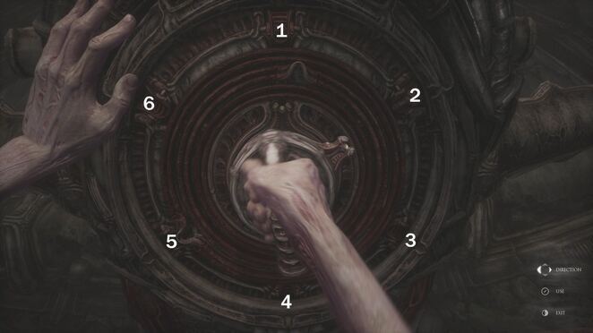 시체 옆 벽에 있는 소켓의 장치를 사용하십시오. 이렇게 하면 회전 퍼즐이 활성화됩니다. 여기에서 각각 'V자형' 표시가 있는 3개의 링을 볼 수 있습니다. 퍼즐을 풀려면 이 표시를 정렬해야 합니다. 그러나 고리의 가장 바깥쪽 부분에 있는 마커만 사용할 수 있습니다. 이것이 이동할 수 있는 6개의 다른 지점이 있으며 각각에서 상호 작용하여 내부 링을 약간 이동할 수 있습니다. 이 퍼즐의 목적을 위해 다음과 같이 레이블을 지정했습니다.