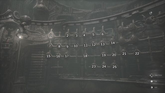 이 두 콘솔은 게임의 첫 번째 작은 퍼즐을 푸는 데 도움을 주기 위해 여기에 있습니다. 한 쌍의 콘솔 맞은편 벽에 장착된 일련의 계란이 격자 모양으로 설정되어 있습니다. 이 그리드의 왼쪽 위 모서리에는 불이 켜진 슬롯이 있습니다. 그리드 자체에 혼합되어 쌍으로 또는 개별적으로 융합된 수많은 계란을 찾을 수 있습니다. 이 계란 중 두 개에 불이 들어옵니다. 빛이 있는 이 알은 활성화되어 있고 나머지는 모두 죽은 상태입니다. 그 중 하나는 하나의 알이고 다른 하나는 죽은 알과 융합되어 있습니다. 그리드의 왼쪽 상단에 있는 불이 켜진 슬롯으로 이동해야 하는 것은 죽은 달걀에 융합된 활성 달걀입니다.