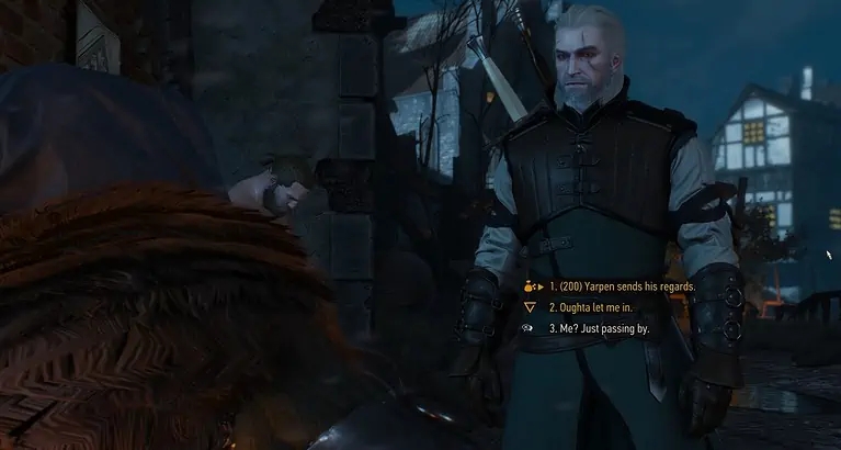 처남 상인도 있지만 Yarpen Zigrin과의 연결 덕분에 드워프가 당신을 알아보고 입장을 허용합니다. 그에게 Delusion 레벨 3(Axii)을 사용하여 무료로 들어오게 하거나 200크라운을 지불할 수 있습니다. 고유한 세 번째 옵션이 있지만 The Witcher 2에서 가져온 특정 저장 파일이 있는 경우에만 사용할 수 있습니다. 이 가이드를 위해 녹화한 플레이 스루에는 없었습니다.