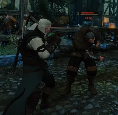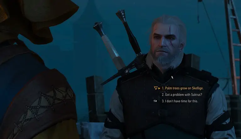 부두 근처의 The Golden Sturgeon 여관 밖에서 오래된 Skellige 해적을 찾을 수 있습니다. 지도에 표시된 위치에 접근하면 두 사람이 싸우는 것을 볼 수 있습니다. 표시된 사람은 Sukrus이고 다른 사람은 그의 처남입니다.