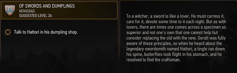 그런 다음 Novigrad에서 Hattori와 대화하는 퀘스트를 받게됩니다. "Of Swords and Dumplings"는 레벨 24 이상의 플레이어에게 권장되는 보조 퀘스트입니다. 물론 도전을 원한다면 더 낮은 수준에서 할 수 있습니다.
