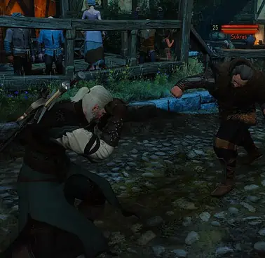 다음은 주먹 싸움 시합에서 거의 모든 사람을 견디는 방법에 대한 빠른 팁입니다: 반격. 상대방의 막대가 빨간색으로 깜박이고 공격하려고 할 때 차단을 사용하면 Geralt가 그를 뒤로 밀쳐 적어도 몇 번의 안타를 위해 열 것입니다.