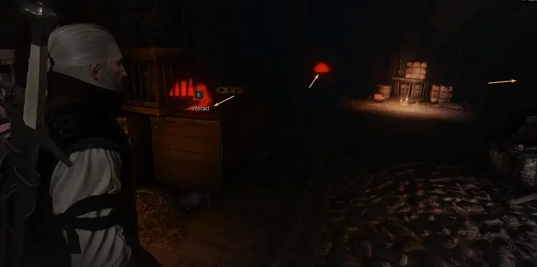 창고에 들어간 후 Witcher 감각을 사용하여 세 개의 상자를 찾아 표시합니다(상호작용). 하나는 문 가까이, 왼쪽에 있습니다. 맨 뒤 왼쪽에 하나. 오른쪽 맨 뒤에 하나.