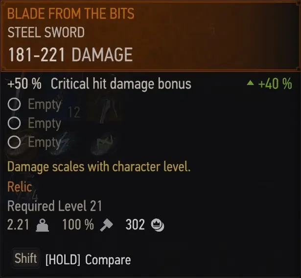 검의 이름은 "Blade from the Bits"입니다. 레벨 21용이며 레릭 레어리티의 스틸 소드입니다. Forgotten Wolf Witcher 강철 검 및 Bear School Ursine 강철 검 (레벨 20용)과 동등 합니다. 검에는 룬을 위한 3개의 빈 슬롯이 있으므로 현재 빌드에 맞게 수정할 수 있습니다.