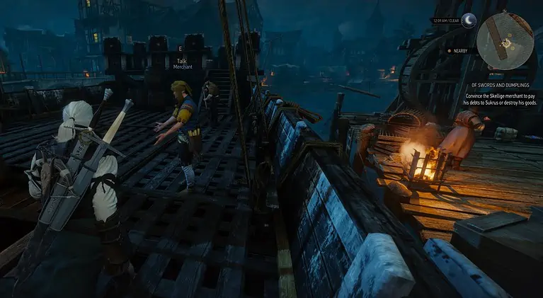 Hattori를 돕고 잠재적 공급업체와의 회의를 주선하는 데 동의합니다. 앞서 언급한 까다로운 포인트입니다. 해가 진 후(밤에) Novigrad의 부두 근처에 표시된 지점으로 이동해야 합니다. 너무 오래 퀘스트를 계속하기 위해 해당 위치로 이동하는 것을 지연하면 핫토리가 사라질 수 있지만 퀘스트를 계속할 수 있습니다.