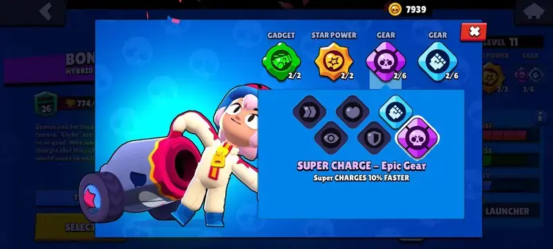 Super Charge Gear는 제작하는 데 1500코인이 드는 또 다른 서사시 장비입니다. 모든 소스의 슈퍼차지 비율을 10% 증가시켜 선택한 수의 브롤러가 슈퍼를 되찾기 더 쉬워집니다. 이 장비는 현재 Ash, Lou, Otis, Bull, Nani, Bonnie, Edgar, Sprout, El primo 및 Jacky에서 제작할 수 있습니다.