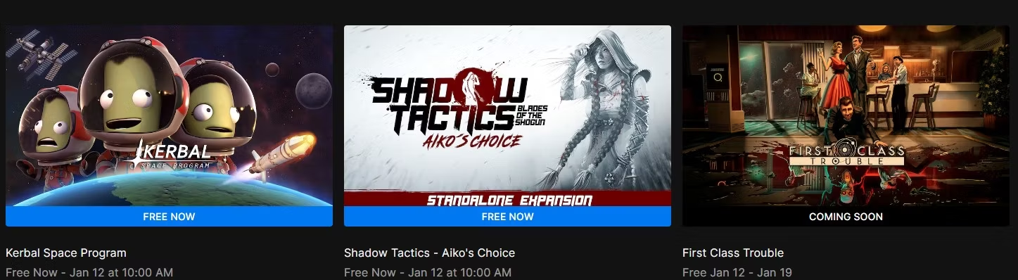 새해 첫 목요일이 다가 오면서 Epic Games Store 는 1월 12일까지 사용할 수 있는 두 가지 무료 게임을 출시하고 1월 12일부터 1월 19일까지 이어지는 퍼스트 클래스 트러블 을 공개 합니다. 오늘부터 다음 주까지 플레이 가능한 게임은 Shadow Tactics - Aiko's Choice 와 Kerbal Space Program입니다.