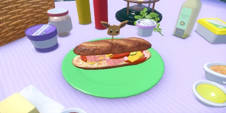 피크닉 테이블 위의 포켓몬 바이올렛에 Herba Mystica가 있는 샌드위치