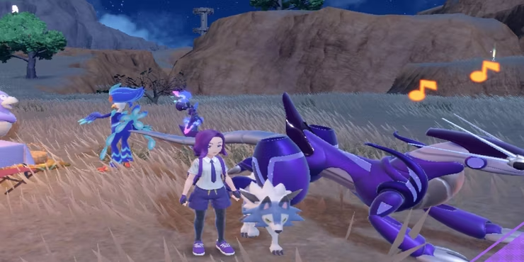 잔디밭에서 다양한 포켓몬과 함께 있는 플레이어의 포켓몬 스칼렛과 바이올렛 스크린샷