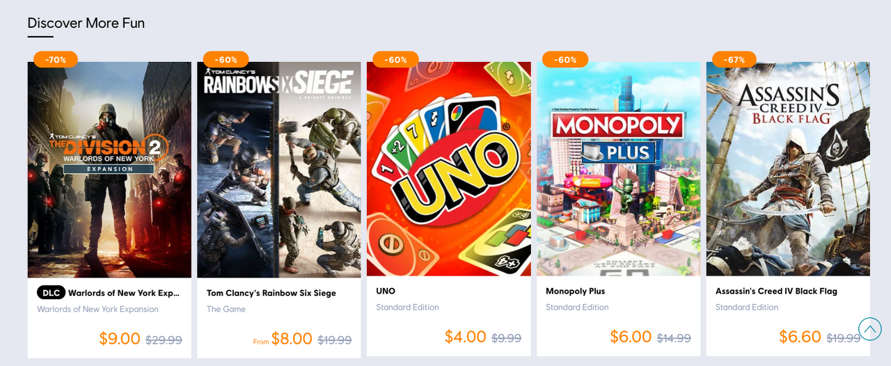 판매에 포함된 타이틀 중 일부는 Tom Clancy 's The Division 2, Rainbow Six Siege, Monopoly Plus, UNO, Assassin's Creed IV Black Flag(아주 멋진 Assassin's Creed 게임인 STEEP 등)입니다. 이 판매 이벤트에는 모두를 위한 무언가가 꽤 많이 있습니다.
