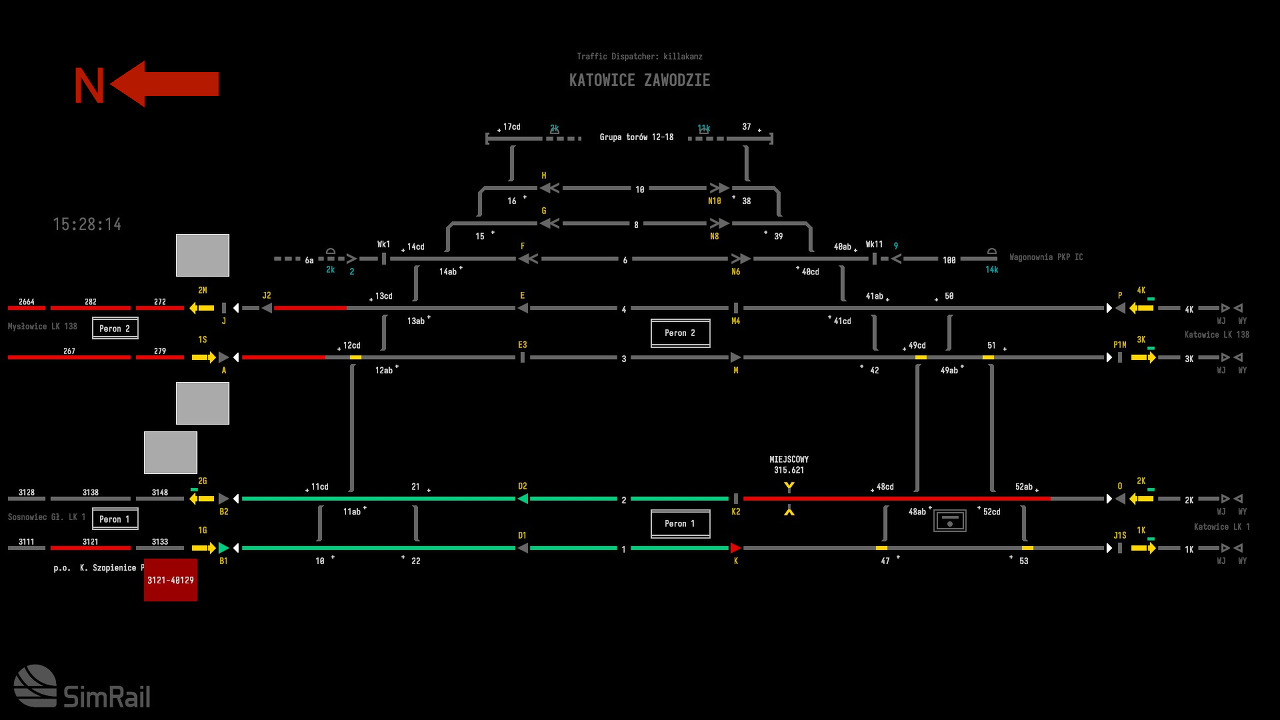 레이아웃의 왼쪽에는 트랙 1P 및 2P로 레이블이 지정된 Sosn.Poludniowy 방향의 두 가지 분기선이 있습니다. 신호자는 이것이 Y 교차점이라는 것을 알고 있어야 합니다. Track 2P는 남쪽에서 Katowice Zawodzie까지/에서 본선 2K 및 1K에 연결됩니다. Track 1P는 북쪽의 Sosnowiec Glowny 역 지역과 연결됩니다.