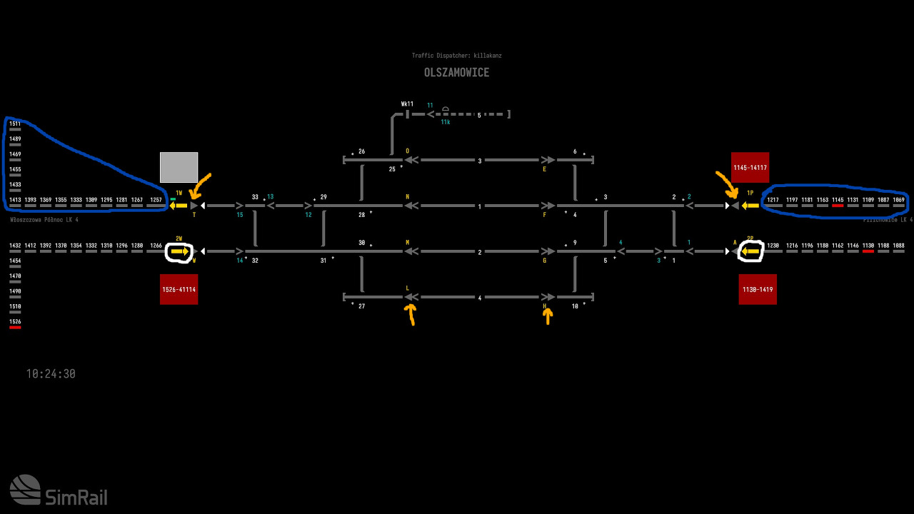 아시다시피 1419호 열차는 2P호선에서 잘못된 방향으로 달리고 있습니다. 사이딩 차선 4로 보내어 나중에 본선을 가로질러 이동해야 하는 1W선으로 다시 이동할 수 있도록 합시다.