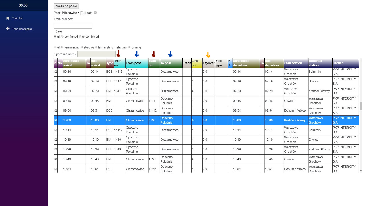 노란색 화살표는 Layover 열을 가리킵니다. 이 열의 숫자가 0,0 이외의 값으로 표시되면 열차가 귀하의 섹션에서 정차할 예정이며 플랫폼에 있을 가능성이 있음을 의미합니다. "PT" 열은 이와 관련하여 두 비트의 정보를 표시합니다. 먼저 로마 숫자(I 또는 II)는 정차하는 플랫폼을 나타내고 숫자(1 또는 2 등)는 사용할 트랙을 나타냅니다. 경우에 따라 단일 플랫폼이 두 개의 트랙을 제공할 수 있습니다.