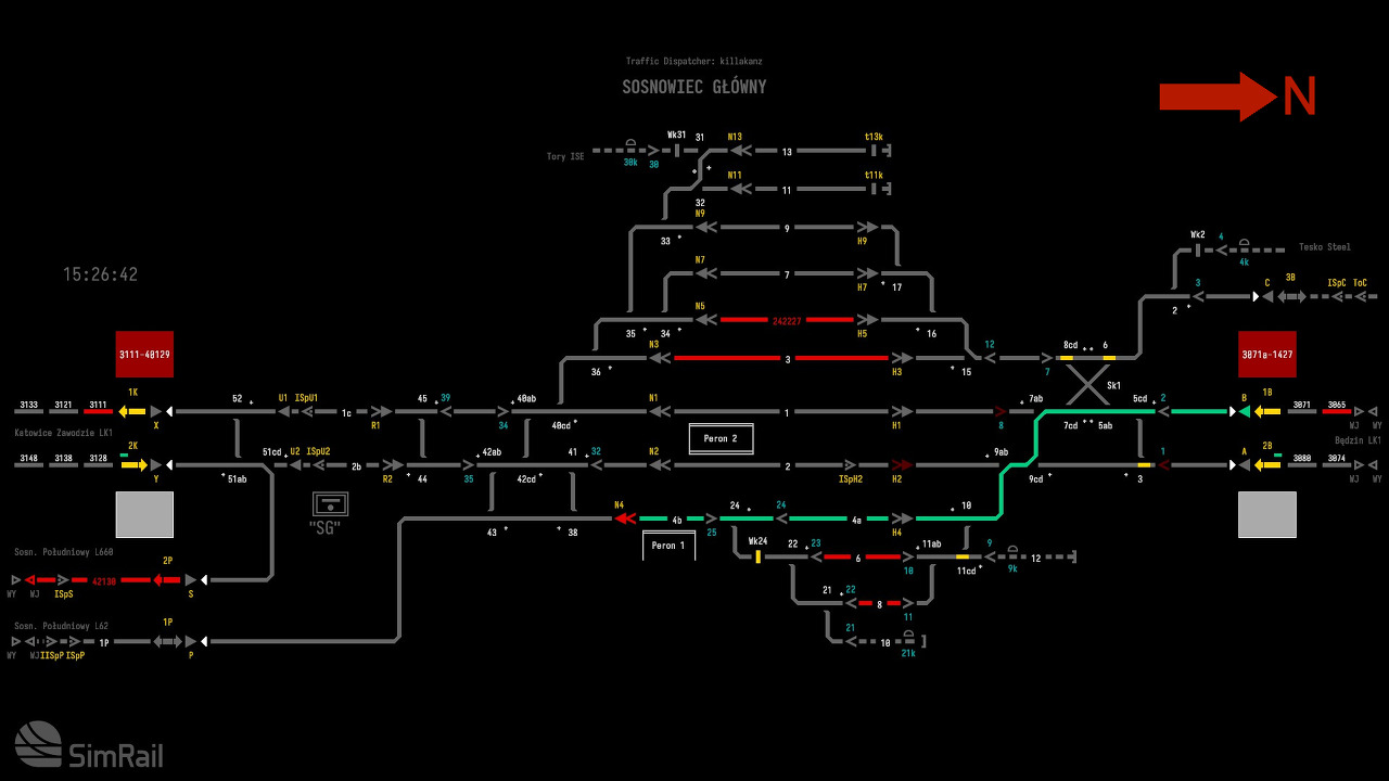 R52 시간표는 레이아웃 왼쪽에 있는 교차로에 대한 것입니다. 다른 시간표는 역 주변입니다. 남쪽에서 오는 열차의 경우 먼저 R52 시간표를 확인해야 합니다. 기차가 거기에서 Sosn.Poludniowy로 가지를 따라 갈라지면 다른 시간표에 나타나지 않습니다. 기차가 Sos.Glowny로 향하고 있으면 다른 시간표에 표시됩니다. 정차하는 경우 승강장 번호와 차선을 확인하고 Bedzin으로 가는지 확인하십시오.