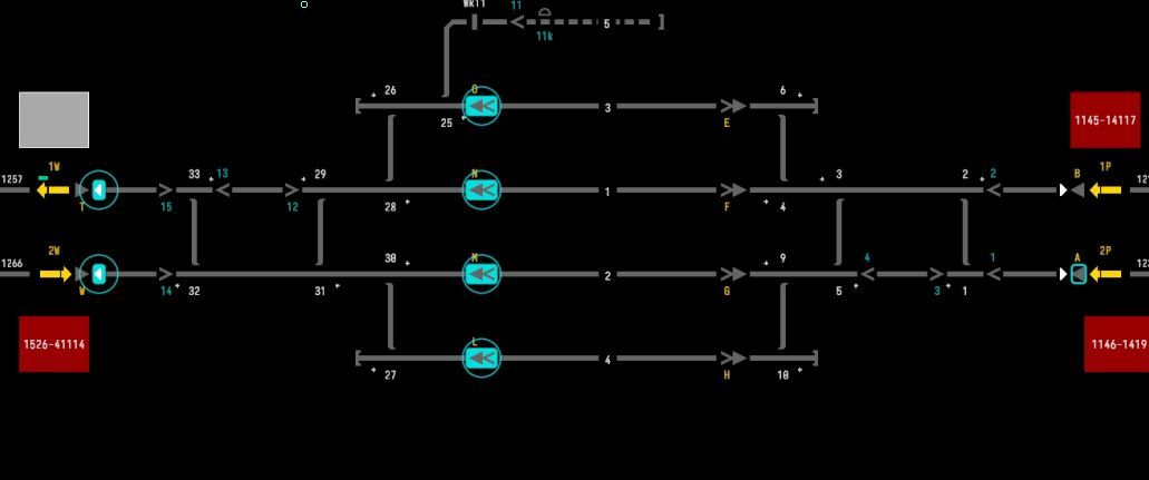 트랙 1P와 2P 모두 양방향 단일 트랙 분기로 간주되어야 하므로 두 가지 모두에 대해 분기 라인 절차를 따라야 합니다. 이 붐비는 교차로에서 기차가 기수를 맞대고 네트워크를 차단하는 것을 방지하기 위해 절차를 항상 준수하는 것이 매우 중요합니다. 기차를 타기 전에 항상 선로가 깨끗한지 확인하는 것을 잊지 마세요. AI 상자가 선로가 깨끗한지 물었지만 그렇지 않은 경우에는 선로가 깨끗하다고 말하지 마세요!