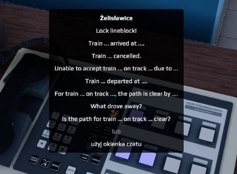 기차를 보내는 경우 이웃 상자(Zelislawice)에 전화를 걸어 "Is the path for train ... on track ... clear?"라는 텍스트 옵션을 사용하여 기차 번호와 트랙 1을 입력해야 합니다. 이웃 상자는 다음과 같이 응답해야 합니다. 경로는 분명합니다.