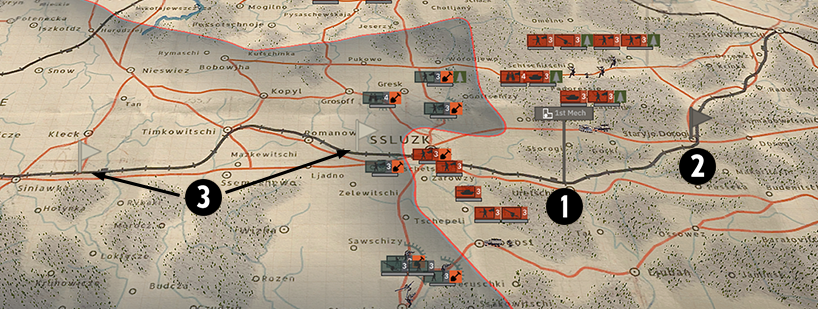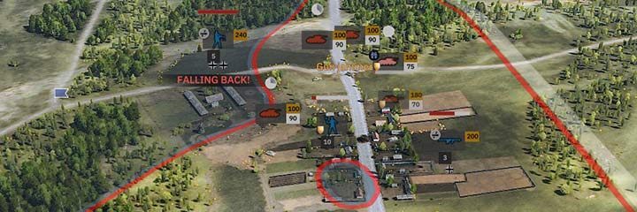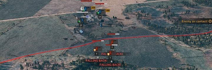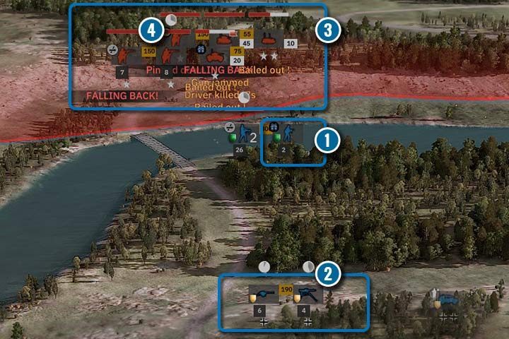 - 유닛 사기 - 각 유닛에는 사기를 나타내는 빨간색 막대가 있습니다(아이콘 바로 위에 있음). 장치가 기분이 좋으면 막대가 보이지 않습니다. 큰 화재가 발생하면 패널이 보이고 채워지기 시작합니다. 예를 들어, 보병은 포격과 화염방사기에 취약하고 탱크는 장갑을 뚫지 못할 수도 있는 대규모 사격에서 더 빨리 공황 상태에 빠집니다. 부대는 패닉에 빠지거나 도망칠 수 있으며 최악의 경우 항복할 수도 있습니다. 또한 그들은 (리더의) 범위에 있는 다른 유닛이 적에게 항복하는 것을 허용하지 않습니다.