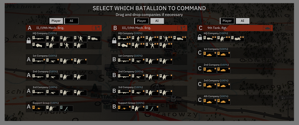 캠페인 지도에 표시되는 각 지상 유닛은 대대를 나타냅니다. 이 대대는 실제 진형의 진정한 표현입니다. 세심하게 조사되어 각 부대가 적절한 유형의 장비 또는 차량과 군인 수를 배치할 수 있습니다.