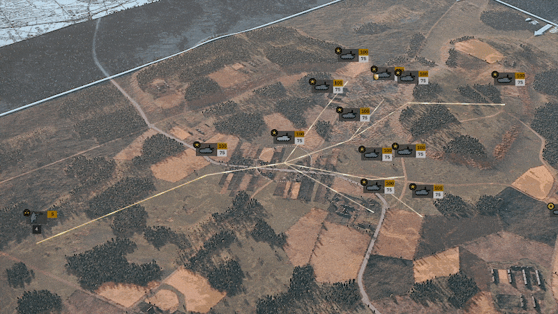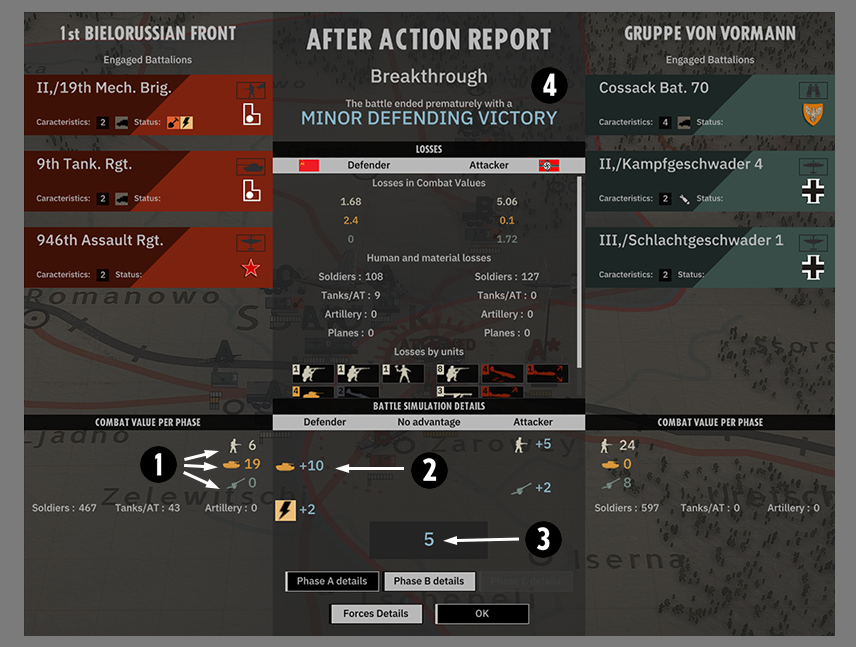 - 두 대대는 기본적으로 같은 양의 전차를 보유하고 있지만(적군은 48대, 독일군은 44대) 독일 전차의 품질은 28.59(높을수록 좋음)인 반면 소련은 14.66에 불과합니다.