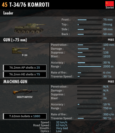 - 단위 통계를 확인하십시오 . 보병은 숫자와 장비가 중요합니다. 군대에 대전차 무기가 있으면 가장 좋습니다. 덕분에 숲과 건물에서 탱크와 싸울 수 있습니다. 그들이 전장에 진입하기 위해 어떤 교통 수단을 사용하는지 주의를 기울이십시오. 장갑 트럭은 매우 유용하며 여전히 전장에서 사용할 수 있습니다. 탱크의 경우 가장 중요한 측면은 장갑과 대포 구경 입니다. 중요한 다른 측면은 높은 이동성, 많은 양의 탄약 및 포인트 모집 비용도 유용할 것입니다. 정찰은 매우 우수한 광학(유닛의 탐지 범위)과 높은 수준의 위장을 갖추어야 합니다.