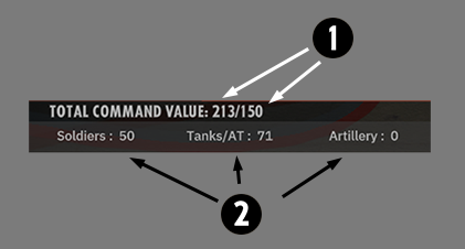 - Total Command Value 아래에는 보병(병사), 탱크 및 대전차포, 포병의 세 가지 범주에 걸친 부대 규모의 분석이 있습니다. 이는 표시 번호이며 무전 요청 지점과 연결되어 있지 않습니다.