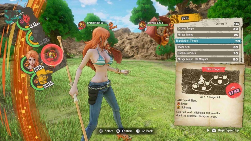 무엇보다 캐릭터의 공격 유형에 약한 적을 공격하는 것이 얼마나 필요한지 강조하는 것이 중요합니다. 특히 게임 전반부에는 약한 적을 제거하기 위해 올바른 캐릭터를 사용하면 단 한 번의 공격으로 약한 적을 죽일 수 있는 경우가 많습니다. Power beats Ranged 및 Ranged beats Technique를 잊은 경우 참조할 수 있는 화면 왼쪽 하단에 공격 삼각형이 있지만, 공격을 위해 강조 표시한 적은 공격이 좋은 생각인지 알려주는 편리한 화살표를 표시합니다. . 공격할 만한 적이 전혀 없다면 아무런 처벌 없이 벤치에서 캐릭터를 전환할 수도 있습니다. Usopp의 새총이 싸움에서 쓸모가 없다면 주저하지 말고 Sanji를 태그하여 강력한 공격을 하세요.
