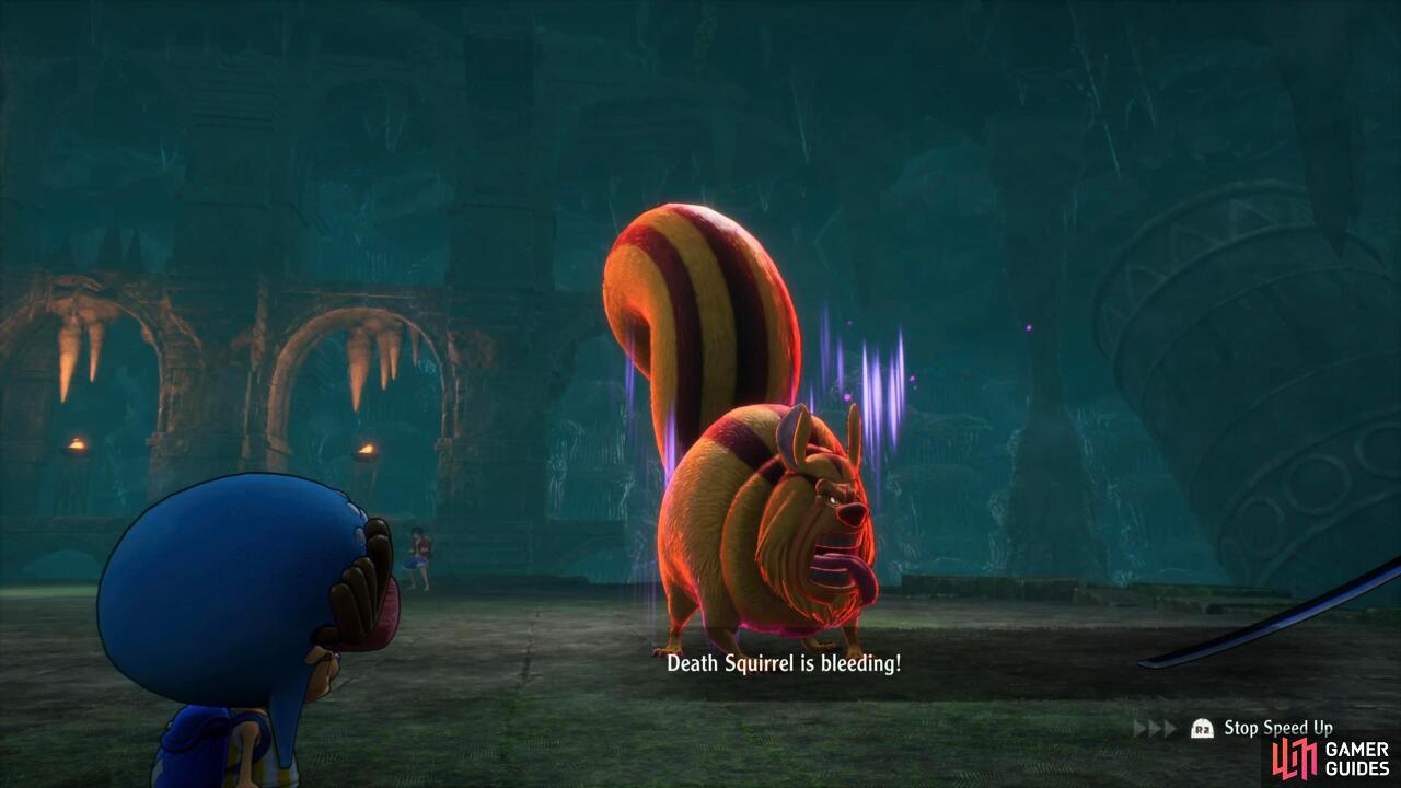 시각적 효과가 있기 때문에 적에게 상태 효과가 적용되었는지 알 수 있습니다. 이 경우 화상 상태 효과가 있습니다. (왼쪽), Zorro는 피를 흘리게 한 이 죽음의 다람쥐를 공격했습니다. (오른쪽)