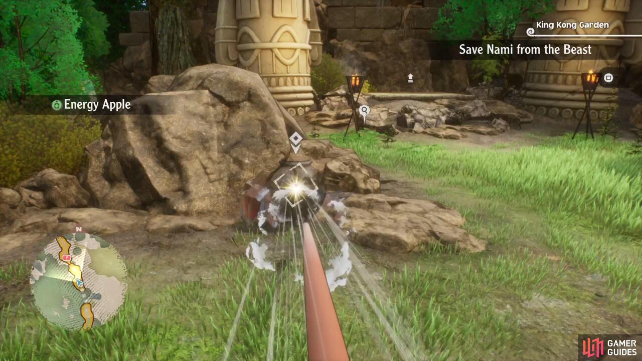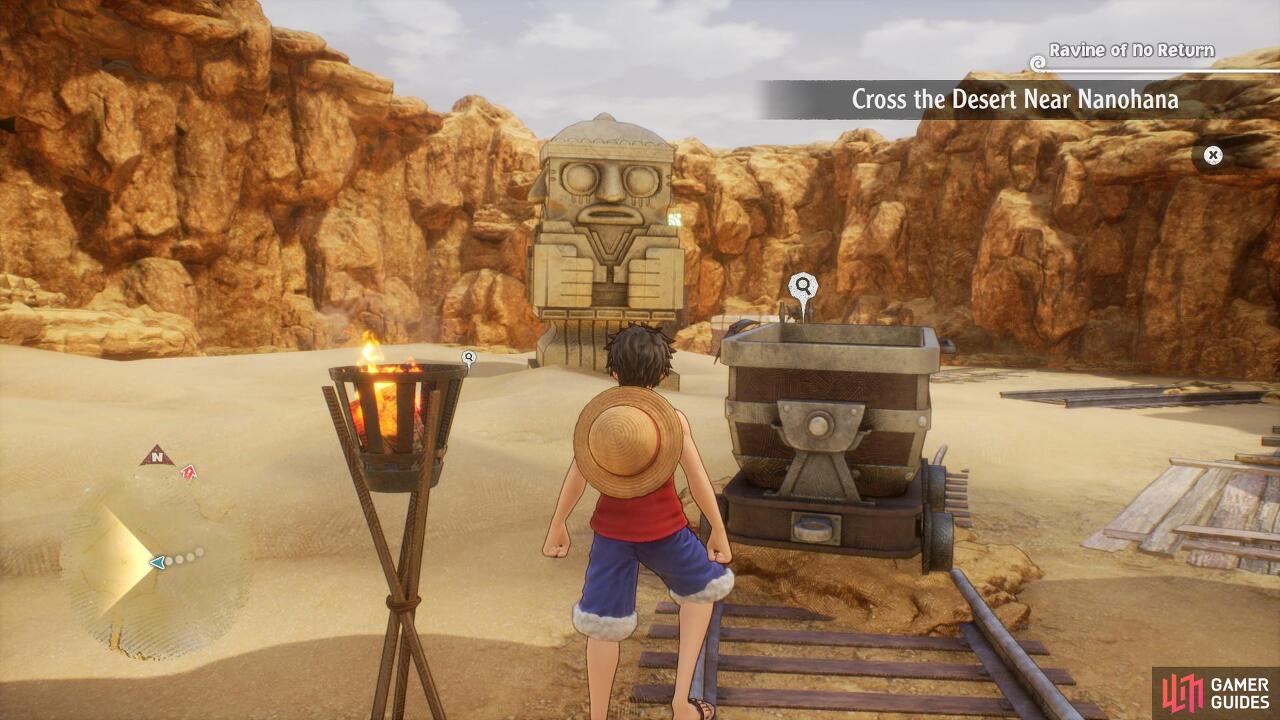 - Zoro 1 : 사막을 통과하여 협곡 지역으로 향합니다. Navi 새가 달린 NPC가 있고 그 옆에는 아치형 폐허가 있습니다. Luffy를 사용하여 Gum Gum이 맞붙으면 폐허를 건너 큐브를 집을 수 있는 방법을 찾을 수 있습니다.