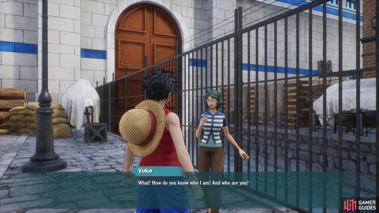 One Piece Odyssey에서 Yuka와 Nina를 찾으려면 Dock 지역에서 남서쪽과 북동쪽으로 이동해야 합니다. 유카부터 시작합시다. Yuka의 위치는 지도의 남서쪽 모서리에 있습니다. 아치형 돌다리를 건너 재료 창고 구역으로 들어간 다음, 사람들이 운하로 떨어지는 것을 방지하기 위해 오른쪽에 있는 금속 울타리를 붙입니다. 유카는 울타리 너머를 보고 있다. 그녀에게 말을 걸면 그녀는 자신이 수줍은 소녀이며 도크에 있는 누군가에게 러브레터를 쓰는 것에 대해 어색함을 느낀다고 밝힐 것입니다. 그러면 두 가지 대화 옵션이 표시됩니다.