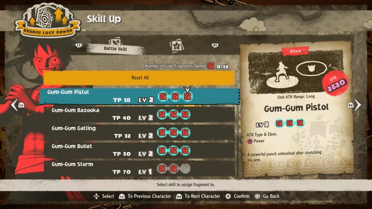 업그레이드가 최대인 One Piece Odyssey 스킬 업 화면
