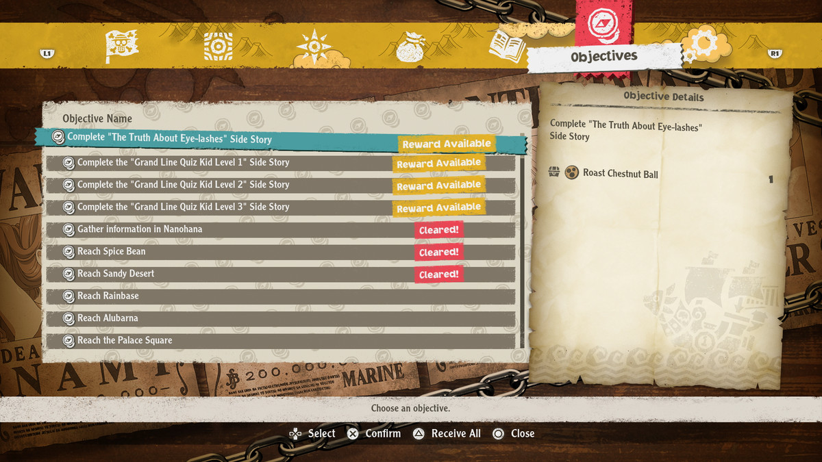 목표를 완료하면 보상을 받지만 자동으로 보상을 받지는 않습니다. 대신 메뉴를 통해 수동으로 목표를 지웠습니다. "보상 사용 가능" 태그가 있는 목표는 제출할 준비가 된 것입니다. 삼각형/Y를 눌러 사용 가능한 모든 목표를 한 번에 제출하고 모든 보상을 받을 수도 있습니다.