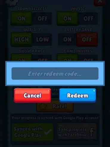 - "사용 코드 입력"이라고 표시된 텍스트 상자 섹션에 Working Hunter Royale 사용 코드를 입력합니다.