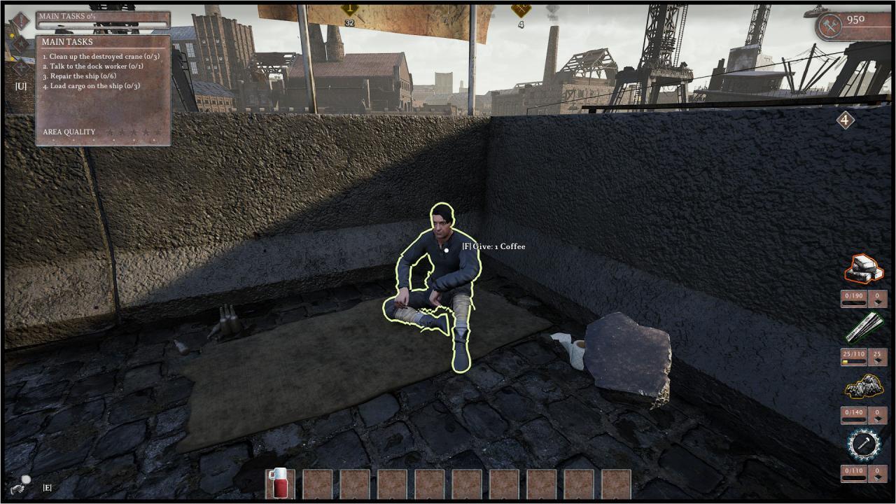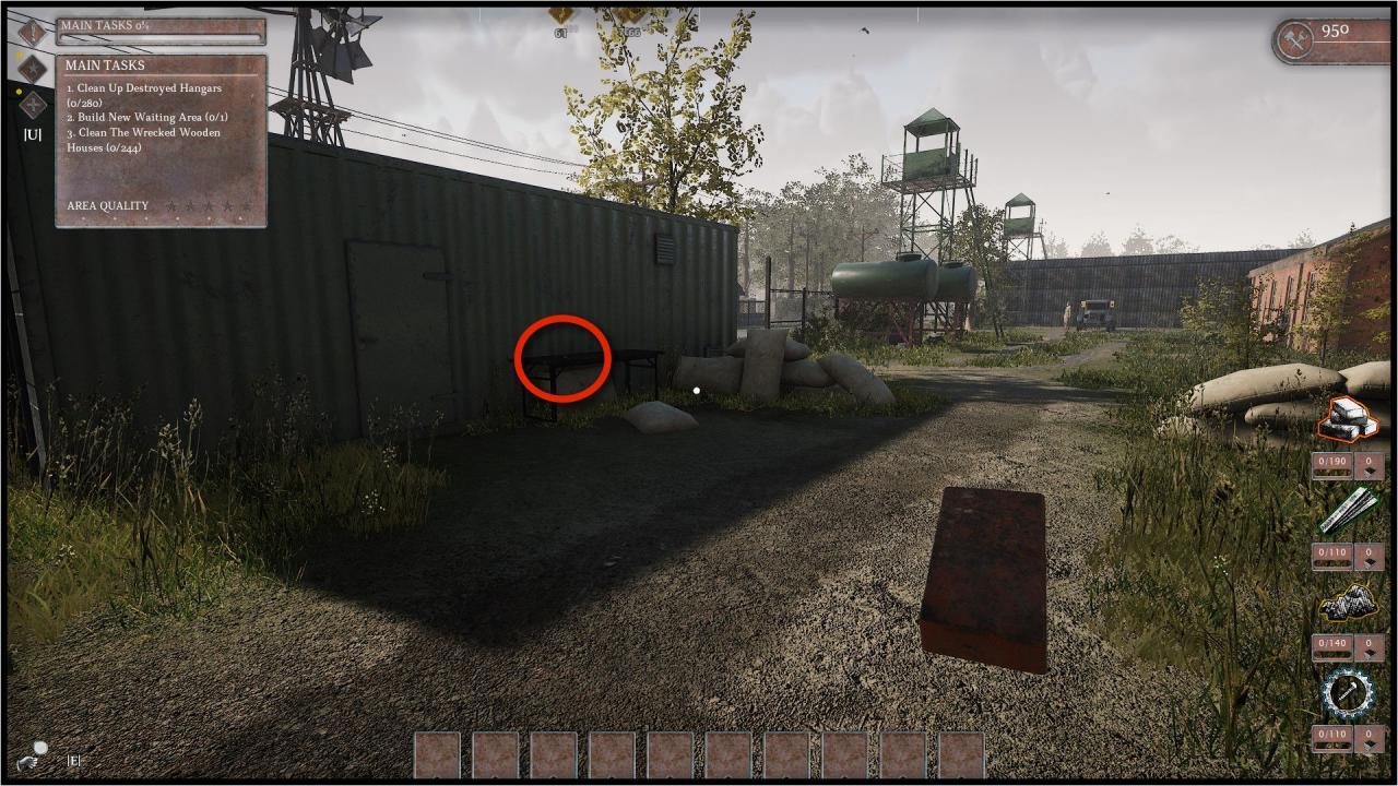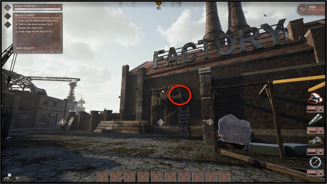 "공장"이라고 표시된 건물 앞의 나무 플랫폼에서. 사다리나 발판을 사용하여 가십시오.