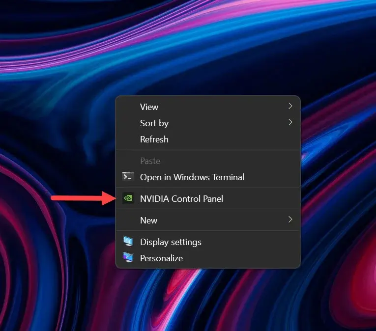 - 바탕 화면을 마우스 오른쪽 버튼으로 클릭 하고 Nvidia 제어판 옵션을 선택하여 Nvidia 제어판에 액세스합니다 .