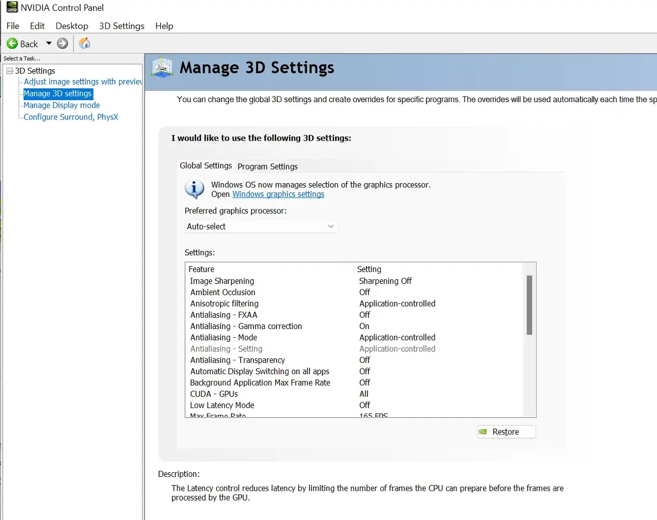 - 세부 3D 설정에서 최상의 성능을 위해 Image Sharpening , Anisotropic Filtering , FXAA 및 Gamma Correction-Antialiasing 을 끕니다.