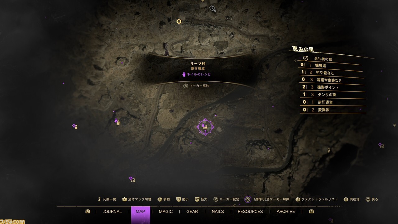 광대한 필드에는 다양한 기도 요소가 준비되어 있어 메인 스토리를 진행하는 사이에 자유롭게 즐길 수 있다. 무엇을 우선하는지는 플레이어의 자유이지만, 휴식이나 크래프트를 할 수 있는 “순례자의 숙소”, 마법을 습득할 수 있는 “축복의 샘”, 만지는 것만으로 프레이의 능력이 상승하는 “탄타의 비”는 우선한다 들러 가고 싶다.