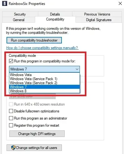 - Windows 10 에서 Rainbow Six Siege를 사용하는 경우 호환 모드 에서 게임을 실행 하고 충돌 문제가 해결되는지 확인해야 합니다.