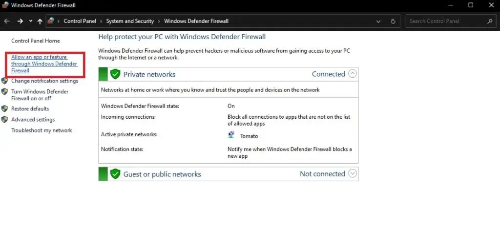 - 열리는 창에서 왼쪽의 옵션을 보고 Windows Defender 방화벽을 통해 앱 또는 기능 허용 을 클릭합니다 .